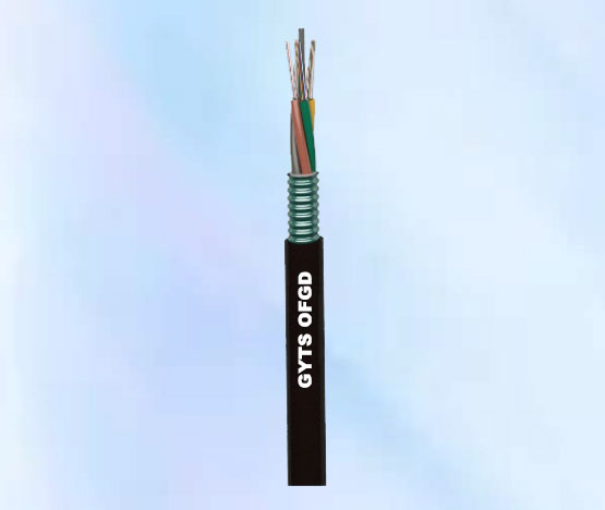 GYTS 光纜的結(jié)構(gòu)是將 250μm 光纖套入高模量材料制成的松套管中,松套管內(nèi)填充防水化合物。纜芯的中心是一根金屬加強(qiáng)芯,對(duì)于某些芯數(shù)的光纜來說,金屬加強(qiáng)芯外還需擠上一層聚乙烯(PE)。松套管(和填充繩)圍繞中心加強(qiáng)芯絞合成緊湊和圓形的纜芯,纜芯內(nèi)的縫隙充以阻水填充物。雙面涂塑鋼帶(PSP)縱包后擠制聚乙烯護(hù)套成纜。